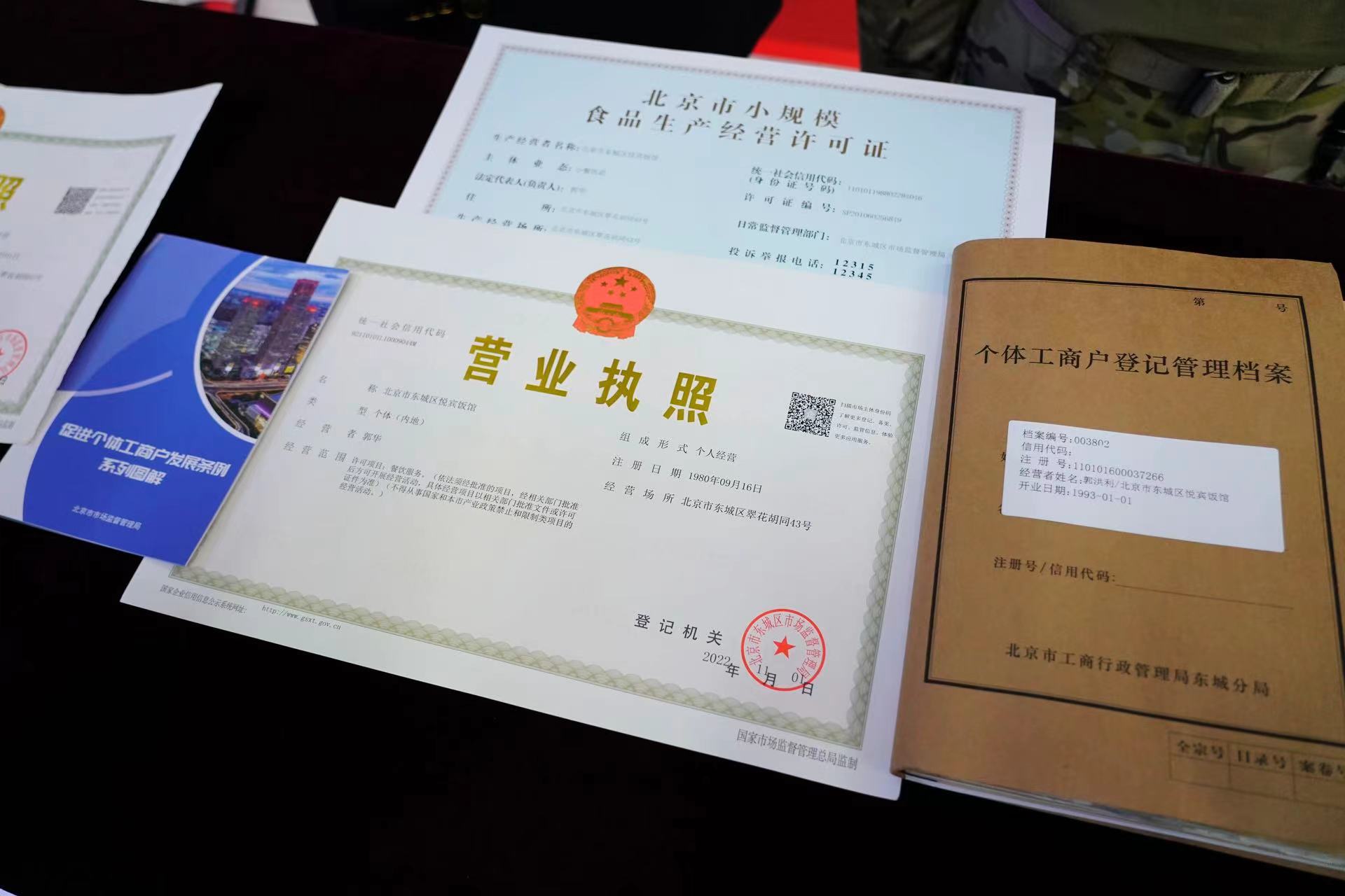 在仪式现场,蒲淳向郭华颁发了依据《条例》申请变更经营相关规定、由东城区市场监管局核发的《营业执照》正本,并发放《条例》宣传解读手册,勉励她继续守法诚信经营,将悦宾饭馆的“金字招牌”传承下去。北京市市场监管局党组书记、局长高念东向郭华颁发同步变更的《食品经营许可证》。