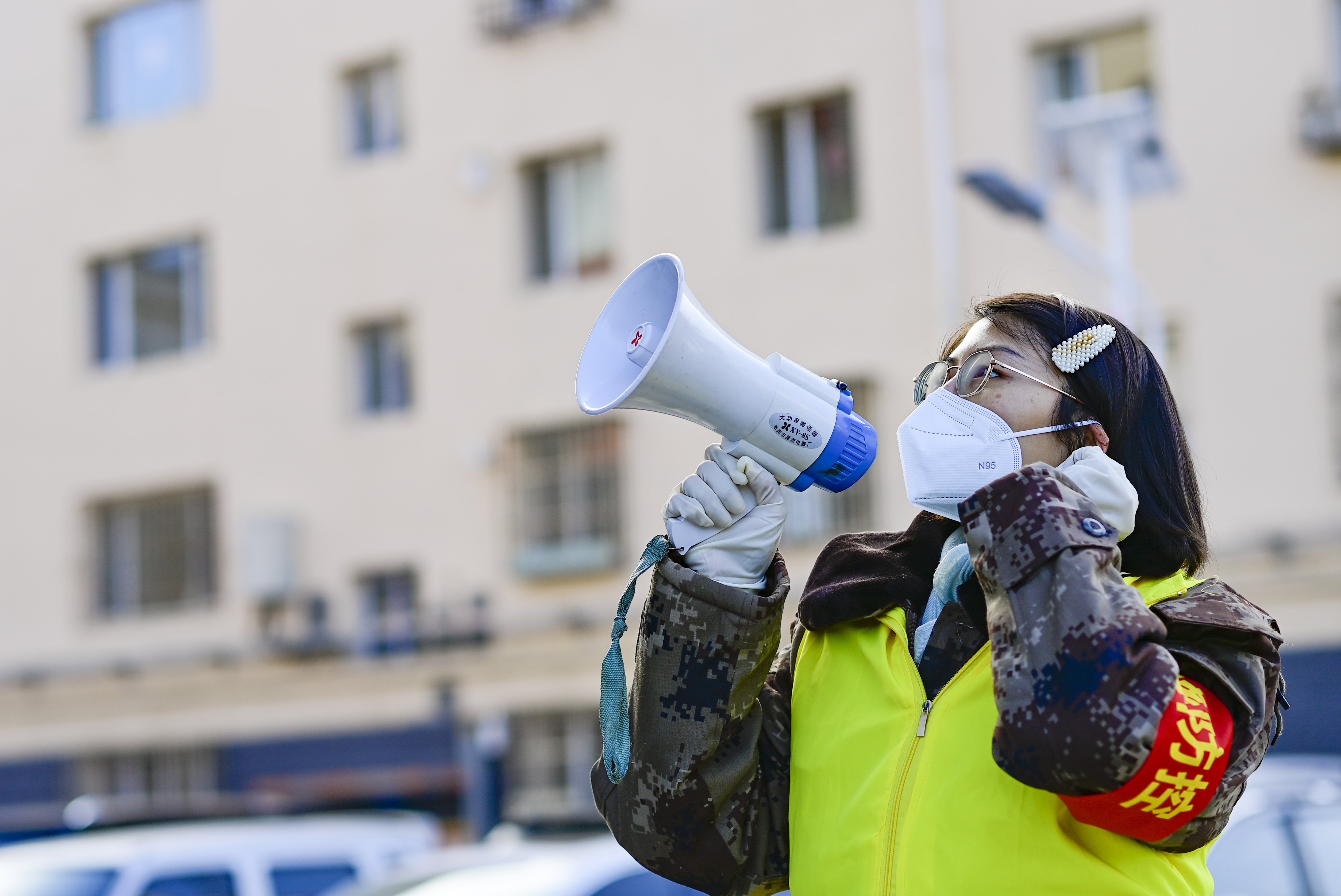 10月7日,内蒙古呼和浩特,明和园社区一位志愿者通知居民参加核酸检测。王正 摄/IC photo