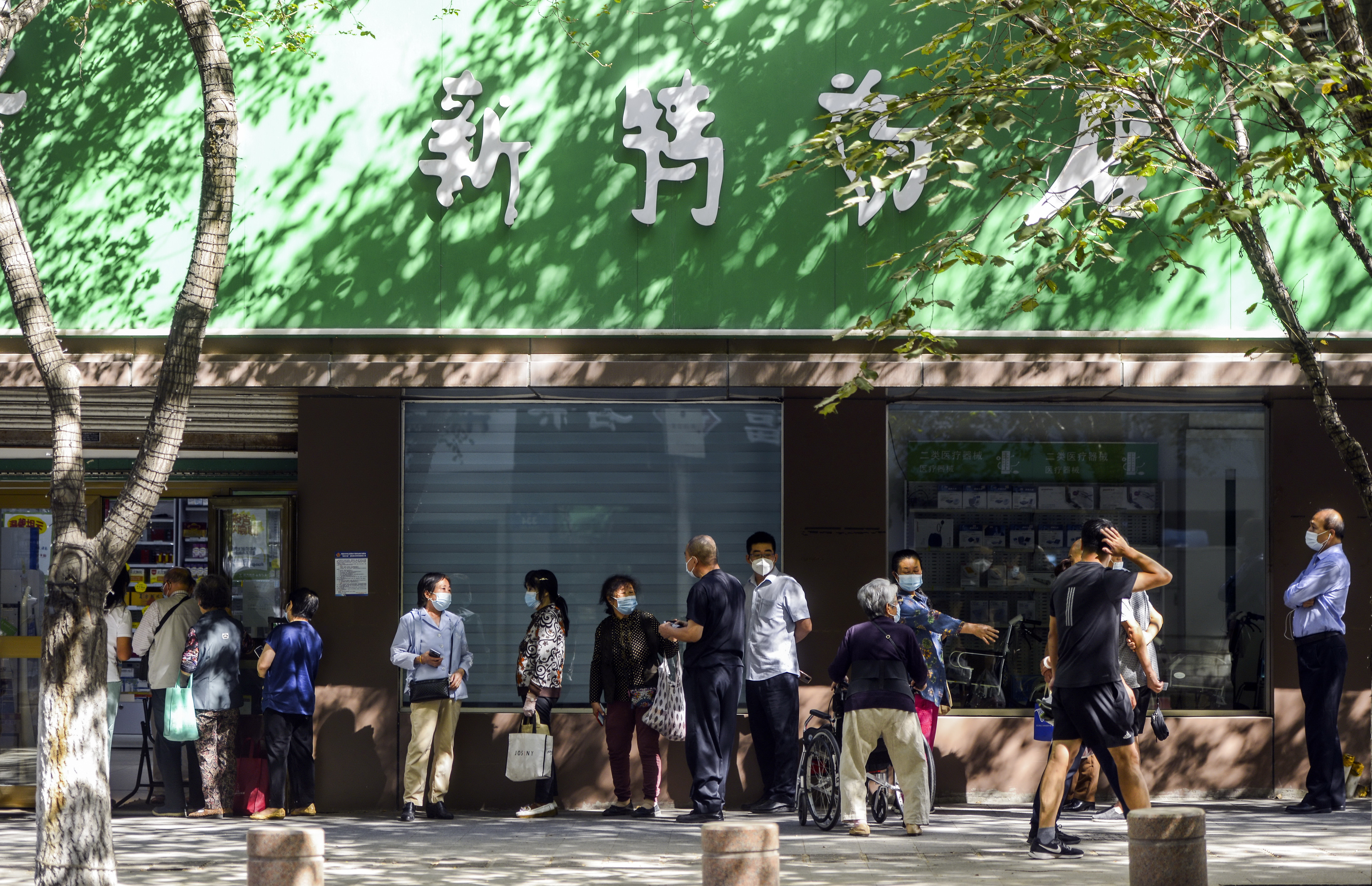 9月5日,新疆乌鲁木齐,不少市民在一处药店外排队购药。刘新 摄/IC photo