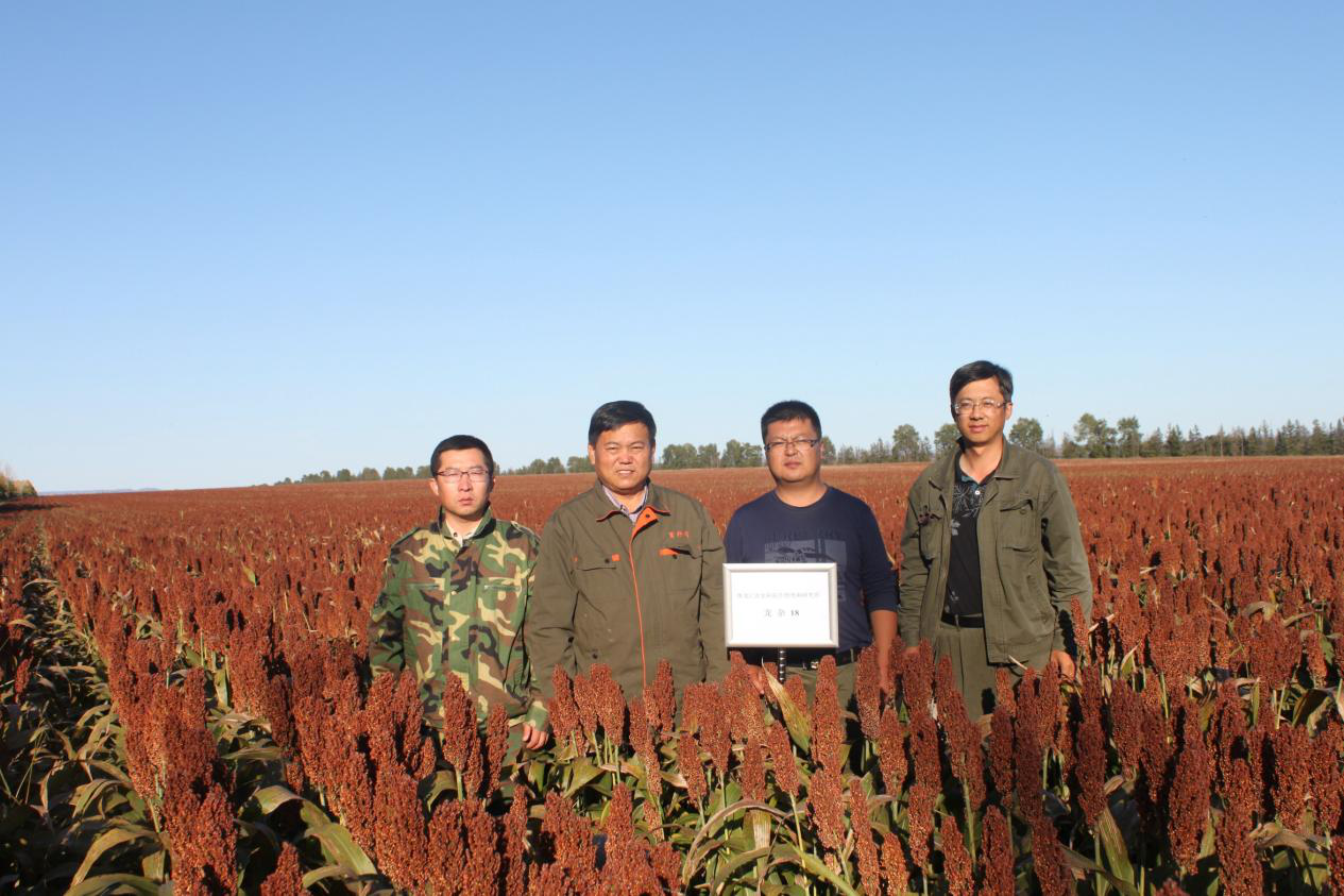 焦少杰研究员(左二)及其选育的龙杂17高粱品种。受访者供图