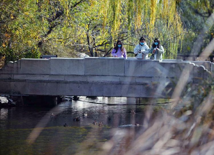 11月3日,国家植物园(北园),三位女孩桥上看鸳鸯。