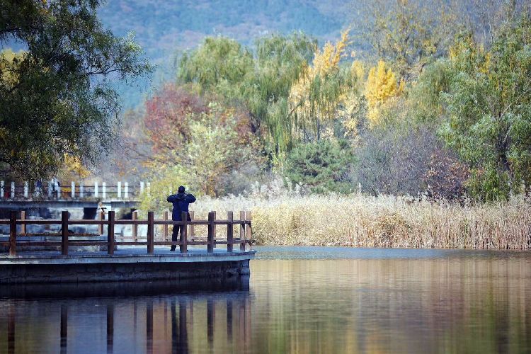 园中各色彩叶树种搭配着碧水远山,营造出绚烂多彩的深秋美景。