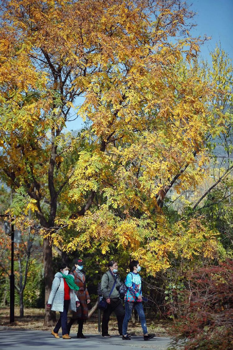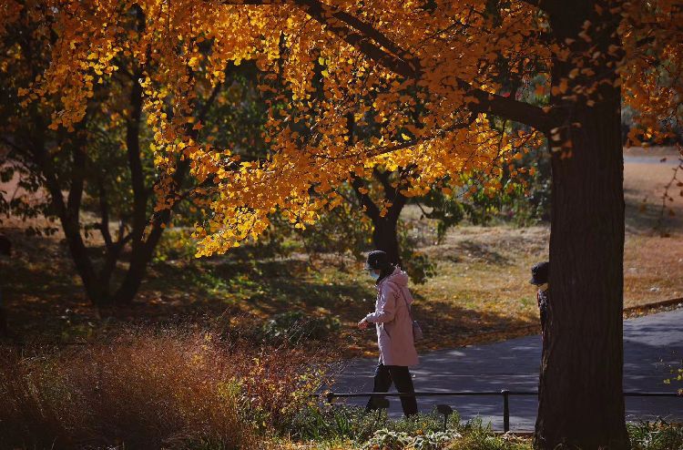 11月3日,国家植物园(北园),游客漫步在金黄的银杏树下。