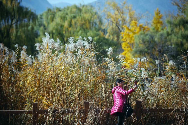 11月3日,国家植物园(北园),一位女士在芦苇旁自拍。
