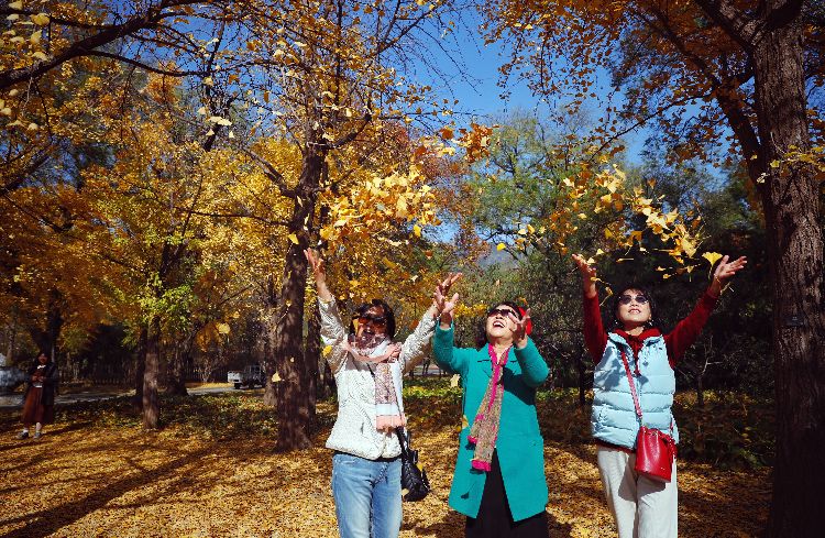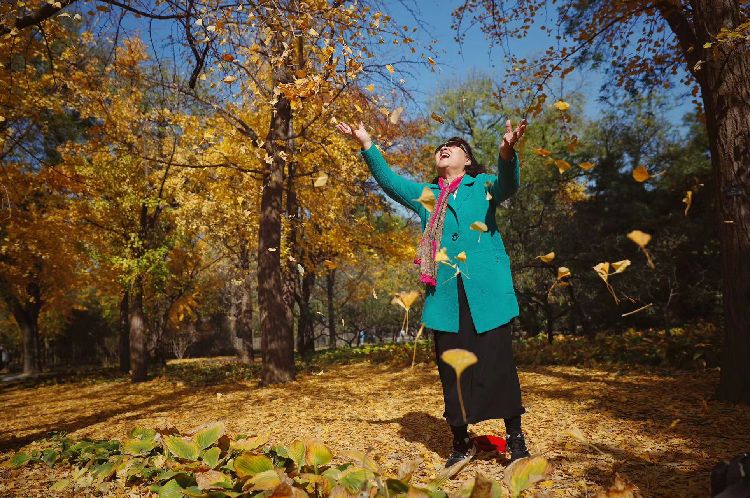 11月3日,国家植物园(北园),一位女士抛撒银杏叶,留住美好瞬间。