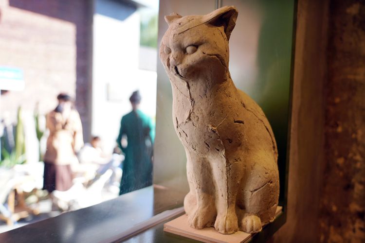 11月4日,德必天坛WE园区北京街,一家网红咖啡店里的猫咪泥塑。街区40余家文化商铺,特点鲜明,包含非遗文化、珠宝文创、时尚买手店、潮玩、文化书店、设计工作室等。