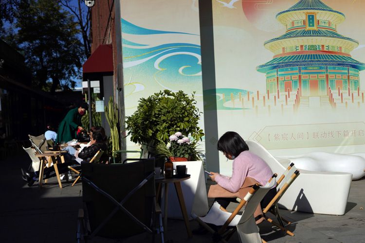 11月4日,德必天坛WE园区北京街,人们晒太阳喝咖啡。德必天坛WE北京街,是北京东城区新兴国潮网红文化地标,广泛吸引年轻一代传统文化爱好者驻足。