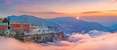 中央民族大学,楼前火红、橙黄的树。