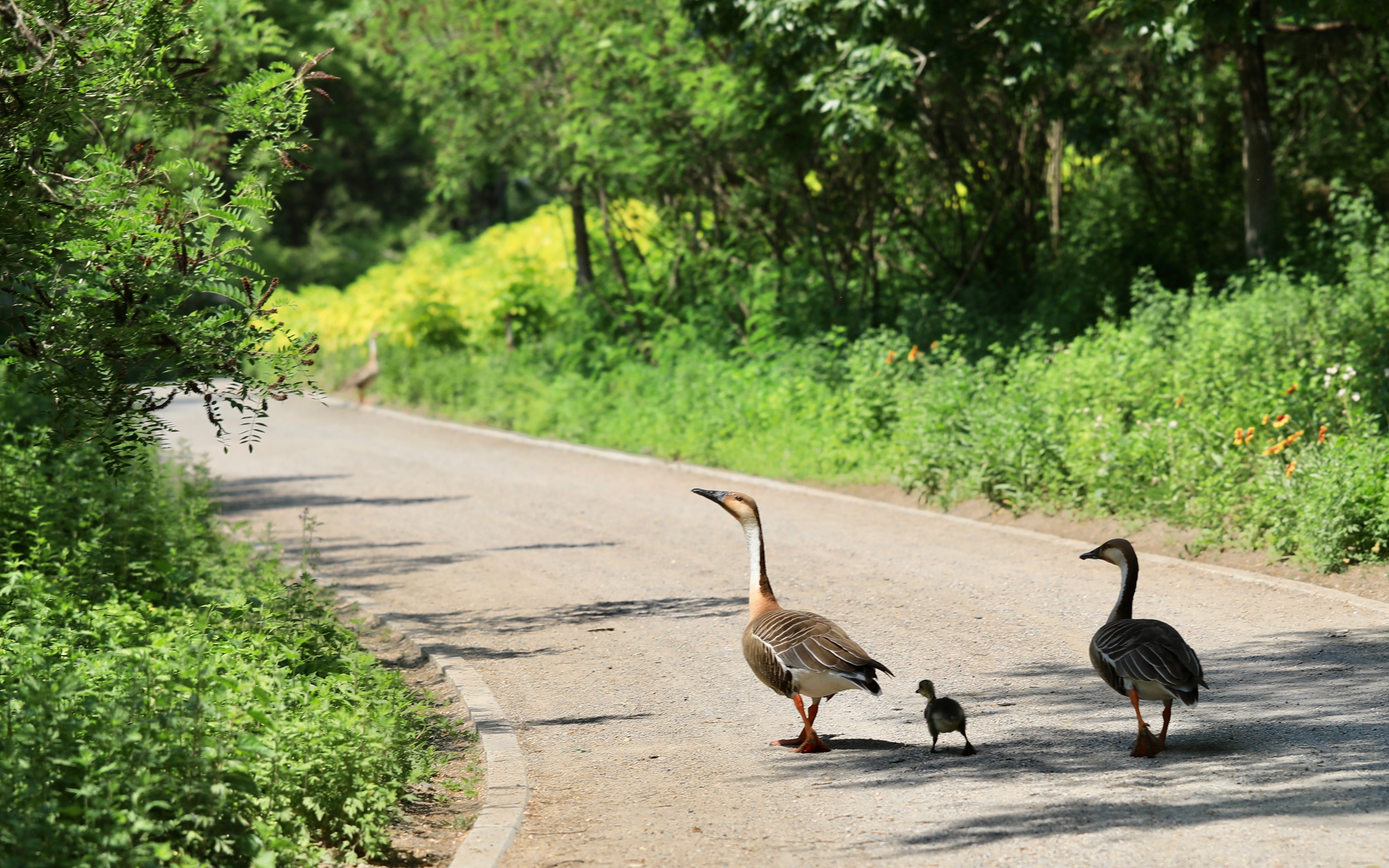 2022年5月22日,大雁“夫妇”带着宝宝在翠湖国家城市湿地公园林间小路上漫步。新京报记者 浦峰 摄