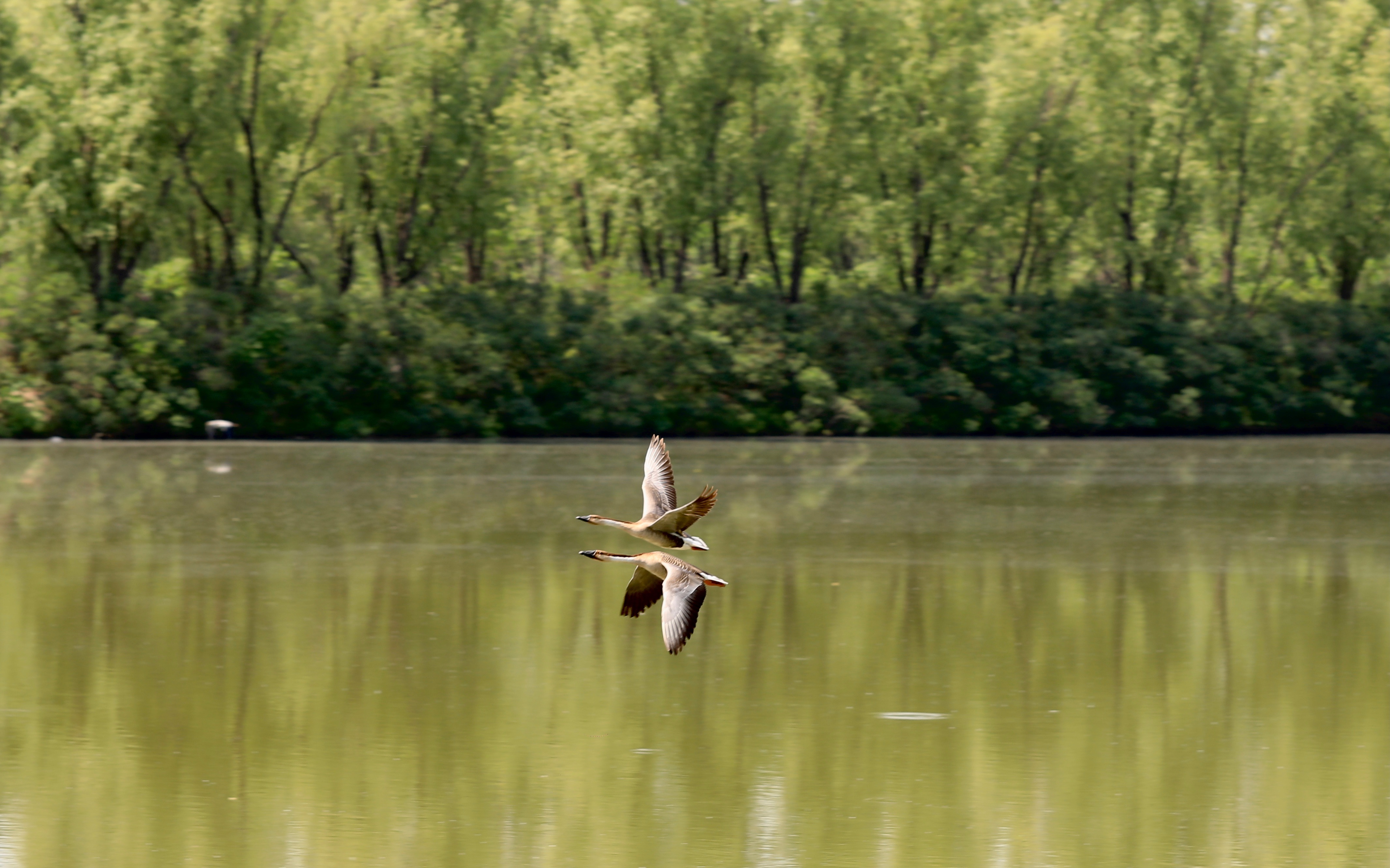 2022年5月22日,翠湖国家城市湿地公园,一对大雁掠过湖面。新京报记者 浦峰 摄