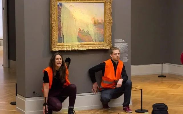 环保组织“最后一代”活动人员向莫奈作品《干草堆》泼土豆泥。图片来自该组织社交平台。