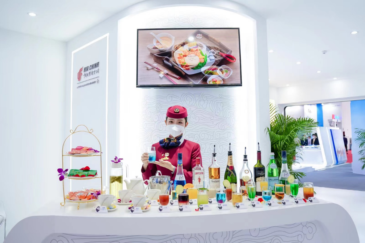 展示国航特色饮品。
