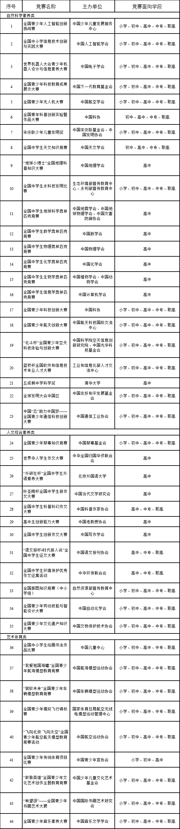 2022—2025学年面向中小学生的全国性竞赛活动名单