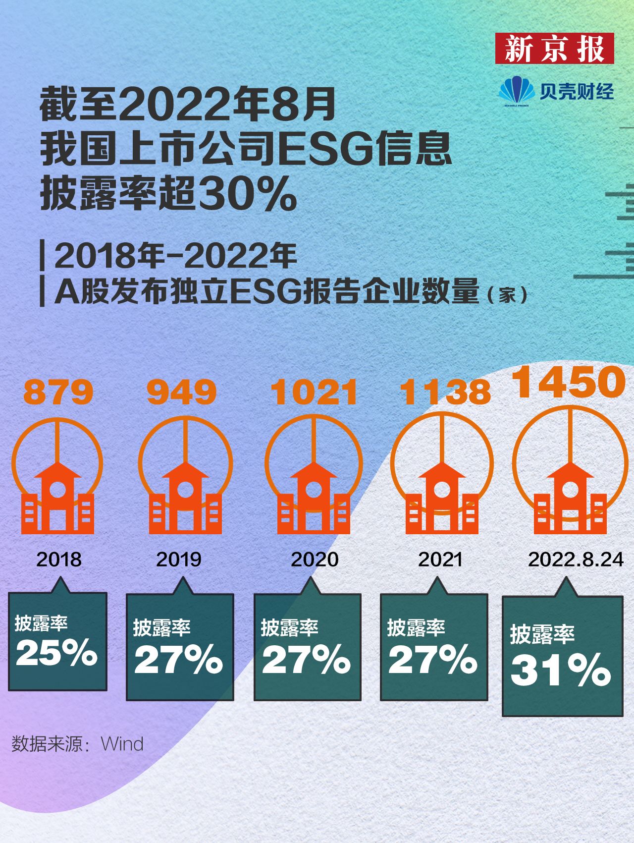 近年来,A股市场中披露ESG信息企业数量逐年增加,2022年上市公司披露率突破30%。据Wind数据,截至2022年8月24日,共有1450家公司发布独立ESG报告,相比2021年,上市公司披露率上升4个百分点,达31%。