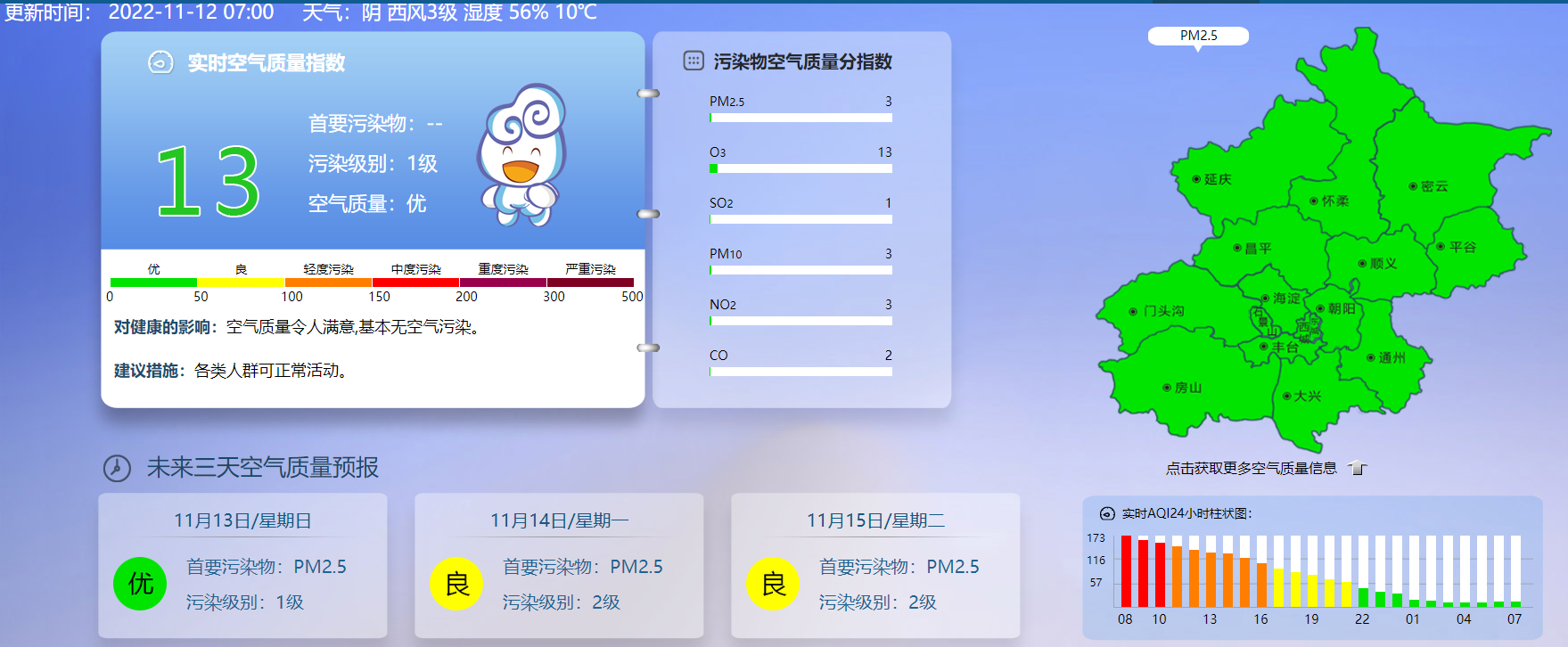 据北京市生态环境监测中心今早7时数据,目前实时空气质量指数13,污染级别1级,空气质量优。