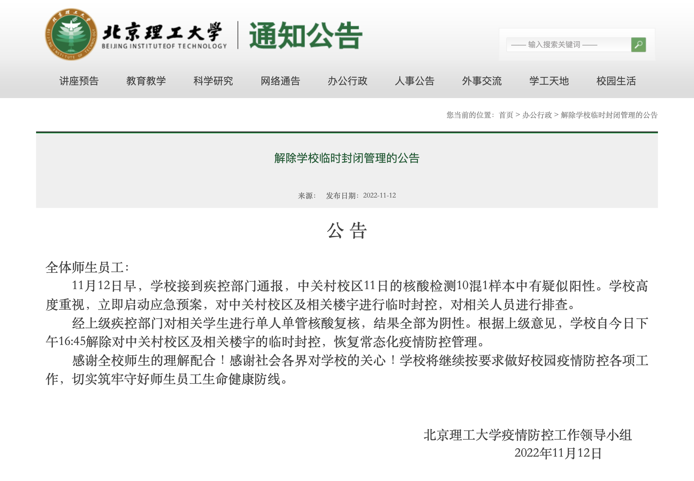 新京报讯 据北京理工大学官网消息,11月12日早,学校接到疾控部门通报,中关村校区11日的核酸检测10混1样本中有疑似阳性。学校高度重视,立即启动应急预案,对中关村校区及相关楼宇进行临时封控,对相关人员进行排查。