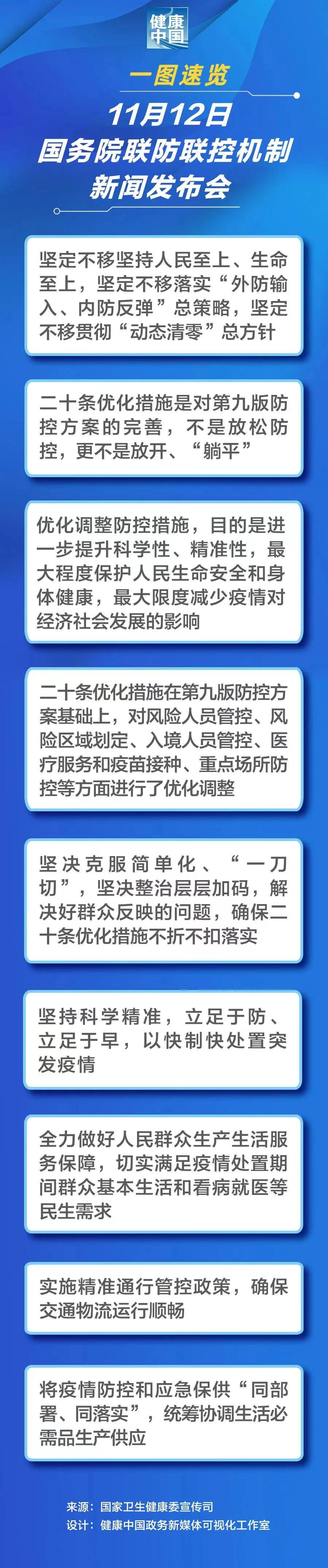 发布会上,国家卫健委新闻发言人米锋介绍,11月11日,国务院联防联控机制综合组发布了进一步优化新冠肺炎疫情防控工作的二十条措施。二十条优化措施是对第九版防控方案的完善,不是放松防控,更不是放开、“躺平”,而是为了进一步提升防控的科学性、精准性,是为了最大程度保护人民生命安全和身体健康,最大限度减少疫情对经济社会发展的影响。