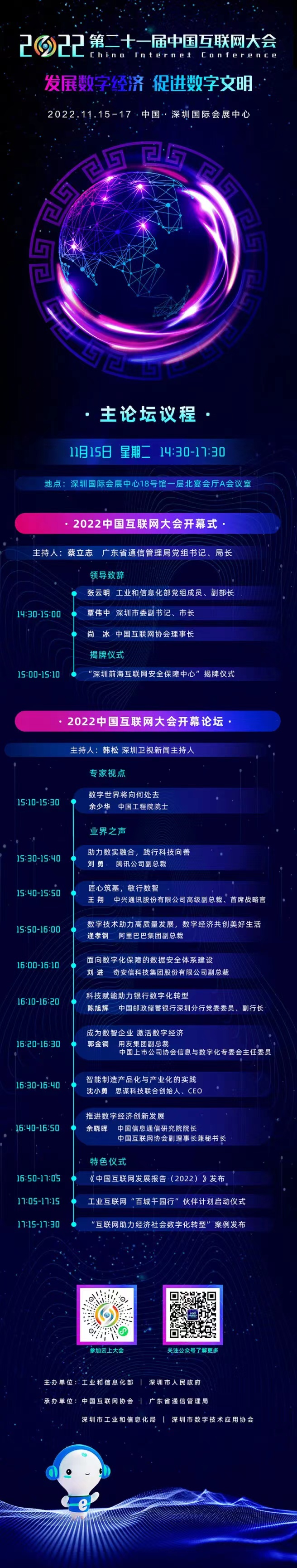 新京报贝壳财经讯 由工业和信息化部、深圳市人民政府主办,中国互联网协会、广东省通信管理局、深圳市工业和信息化局等单位承办的2022(第二十一届)中国互联网大会于11月15日至17日在深圳国际会展中心举办,大会主题为“发展数字经济 促进数字文明”。