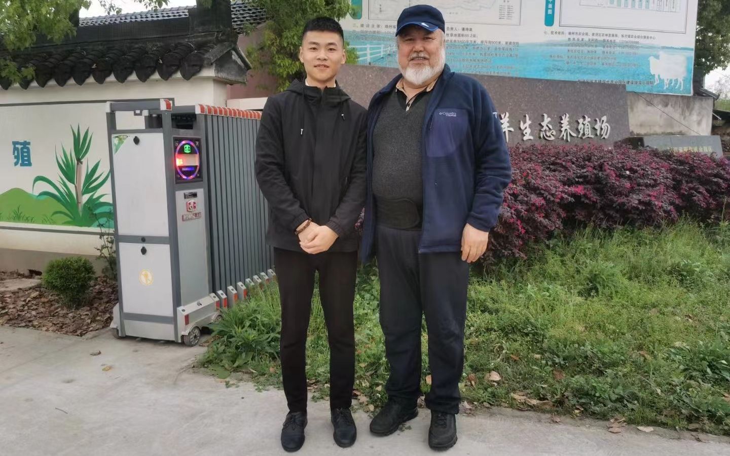 “羊二代”王俊杰(左)在养殖场前合影。受访者供图