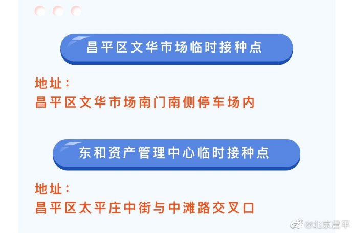 新京报讯 据北京昌平官博消息,近日,北京多区可预约接种“吸入式”新冠疫苗啦!昌平也有两处接种点可预约接种。分别为昌平区文华市场临时接种点和东和资产管理中心临时接种点。这两处接种点,11月17日开始,可电话预约接种吸入式新冠疫苗。昌平区新冠疫苗接种点信息公示: