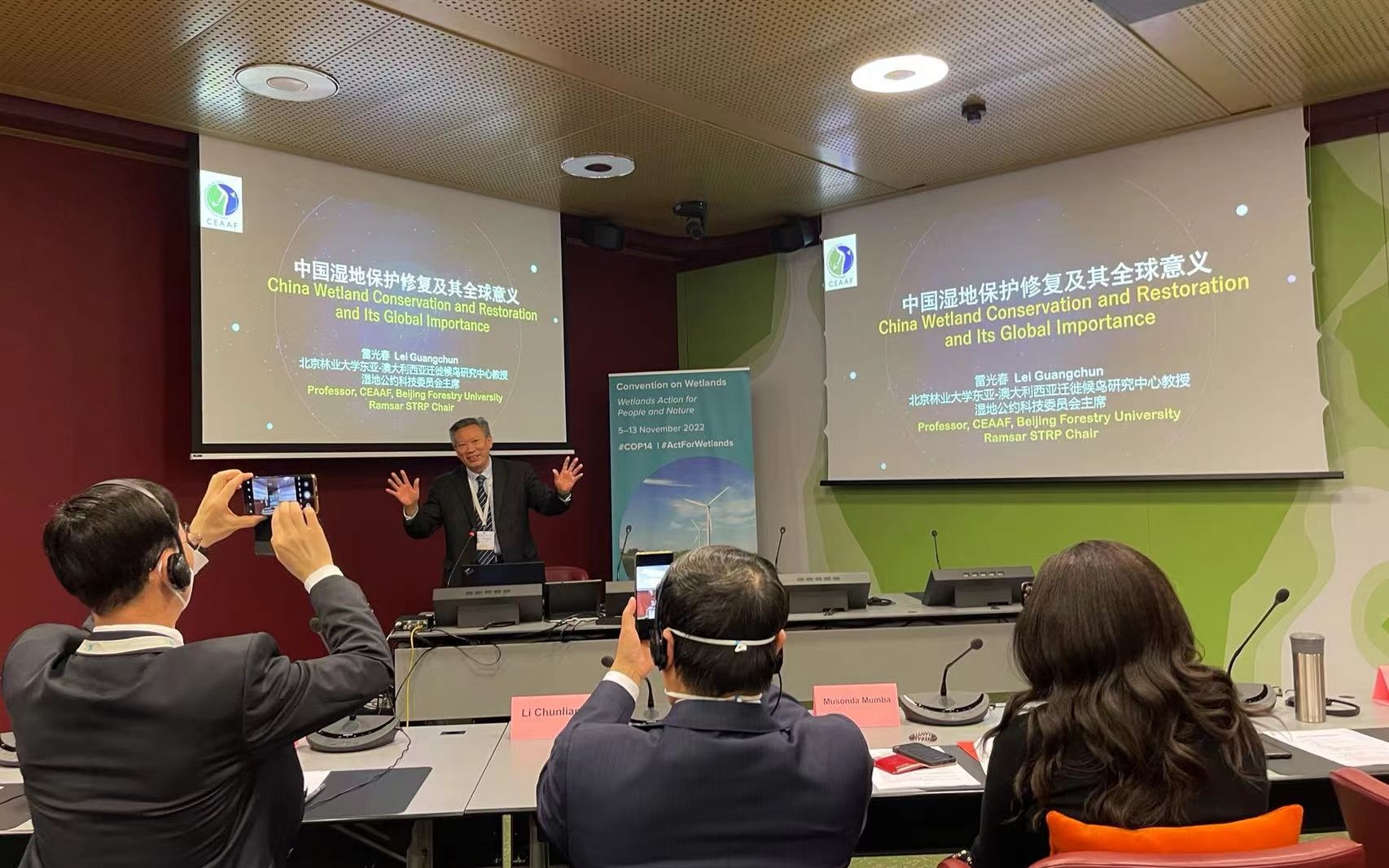 雷光春在瑞士日内瓦介绍中国湿地保护及其全球意义。 受访者供图