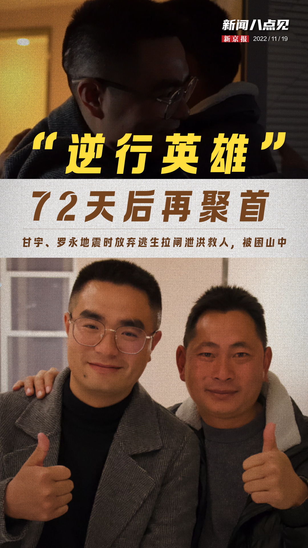 11月18日,罗永在出发参加新京报主办的“点赞逆行者”致敬典礼前,到酒店看望参加考试的甘宇。这是两人在泸定地震分别72天后,第一次见面。两人见面后拥抱问候,关心对方的伤情。罗永说,甘宇更帅气了,比获救时胖了一些。甘宇说,两人此前交情就很好,经历过生死后感情更深。甘宇和罗永在泸定地震中逆行拉闸泄洪,救下百人却错过最佳逃生时机。甘宇获救后,曾与罗永视频通话向罗永致谢,两人约好身体恢复后一起吃饭。视频>>>