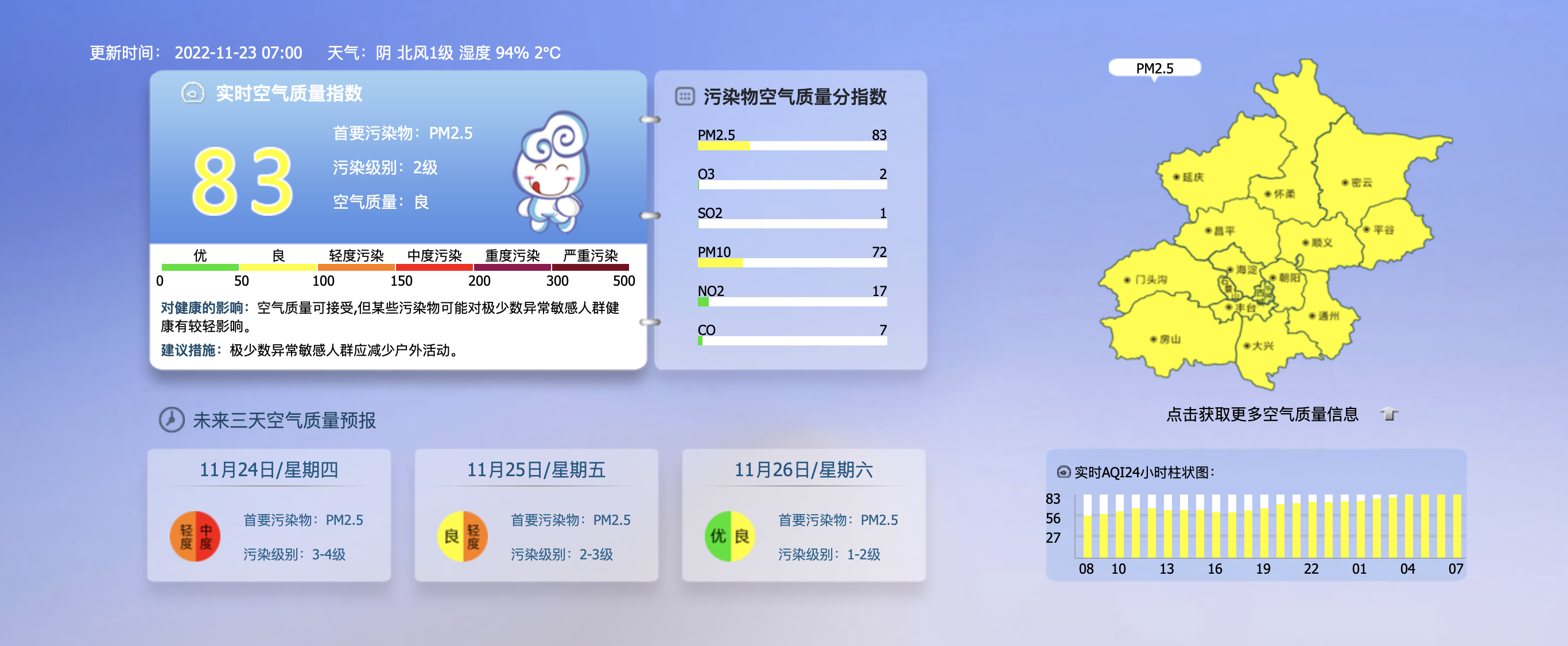据北京市生态环境监测中心今早7时数据,目前实时空气质量指数83,污染级别2级,首要污染物PM2.5,空气质量良。