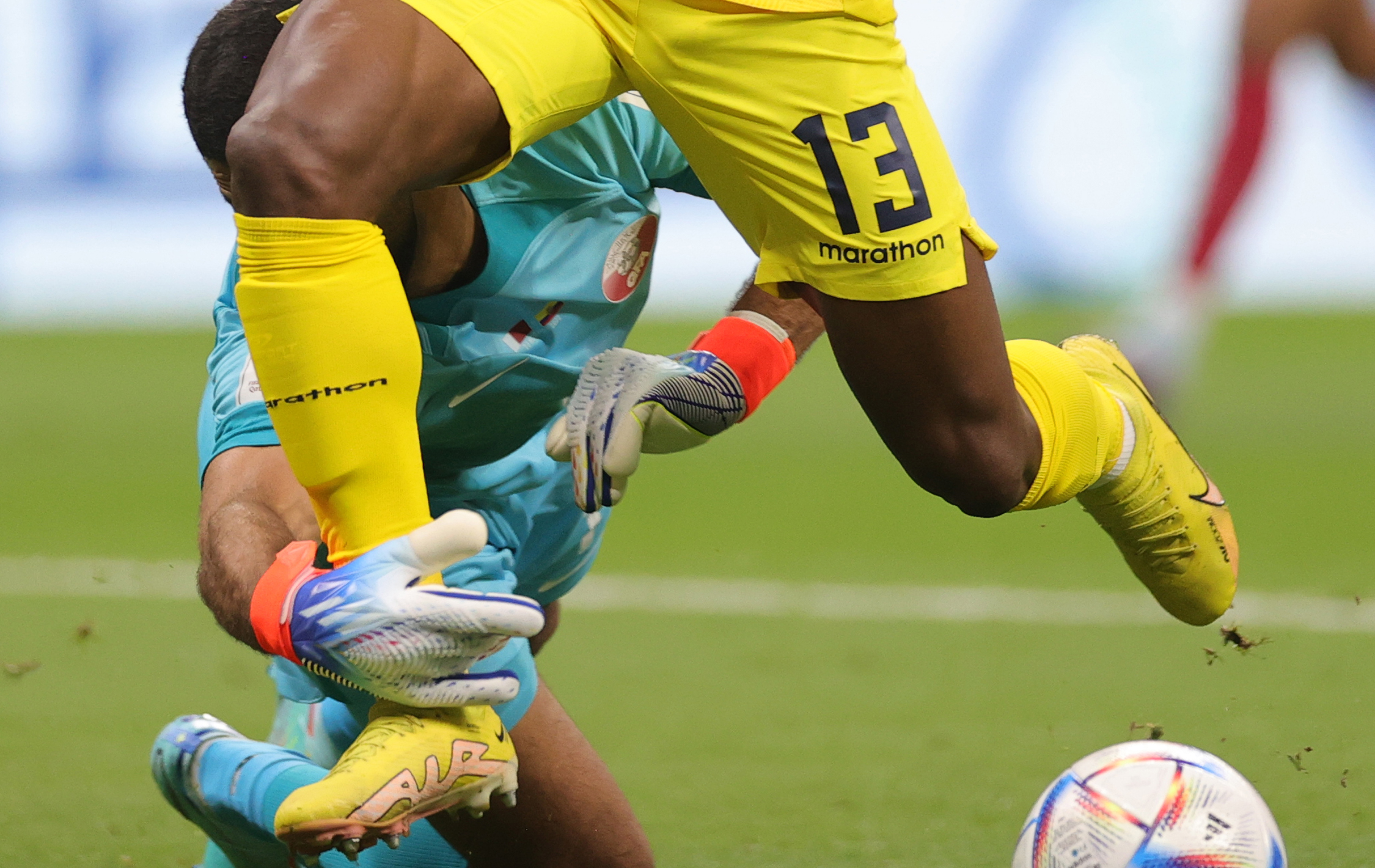 卡塔尔门将阿尔西卜出击绊倒了瓦伦西亚,厄瓜多尔获得点球。 图/ICphoto