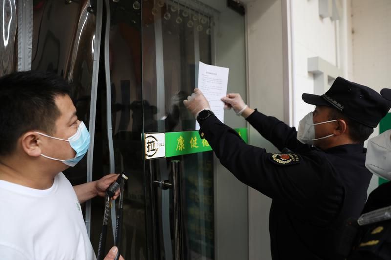 ▲2022年11月21日,朝阳区南磨房乡执法人员向商户告知疫情防控相关政策后,张贴《配合疫情防控告知书》。 新京报记者 王飞 摄