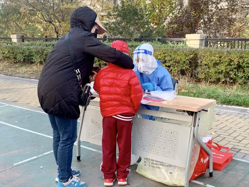 ▲2022年11月21日,大兴区天宫院街道融汇社区,母子俩正在接受核酸检测。新京报记者 郑新洽 摄
