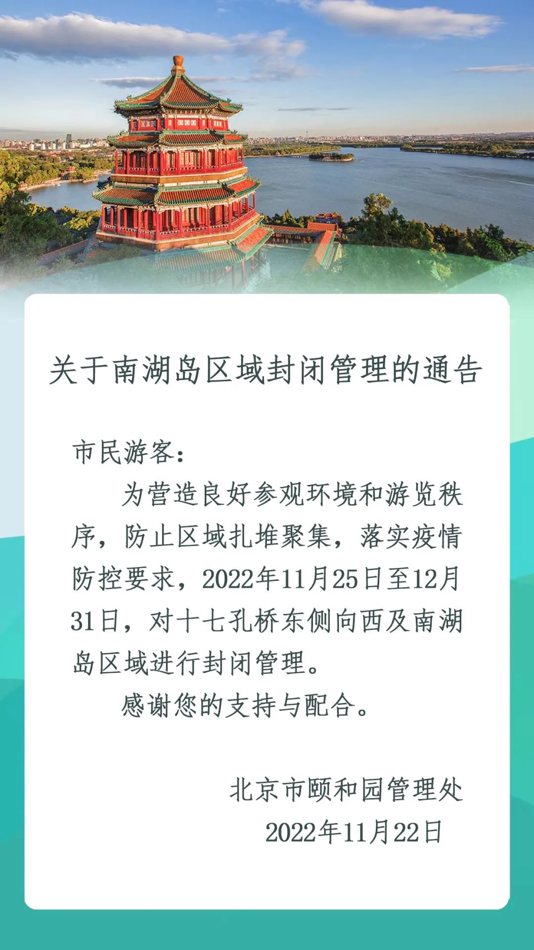 11月25日至12月31日颐和园南湖岛区域封闭