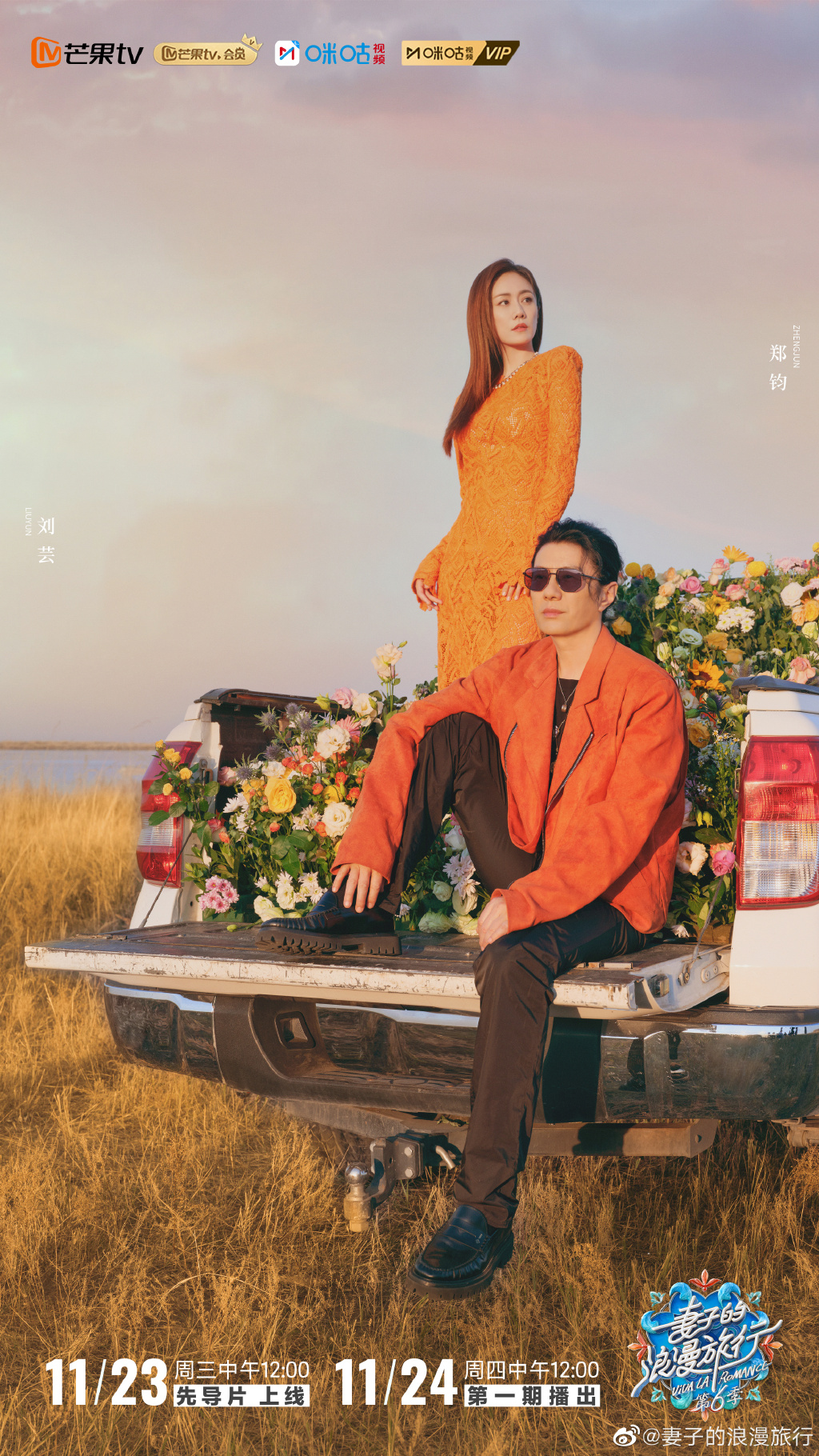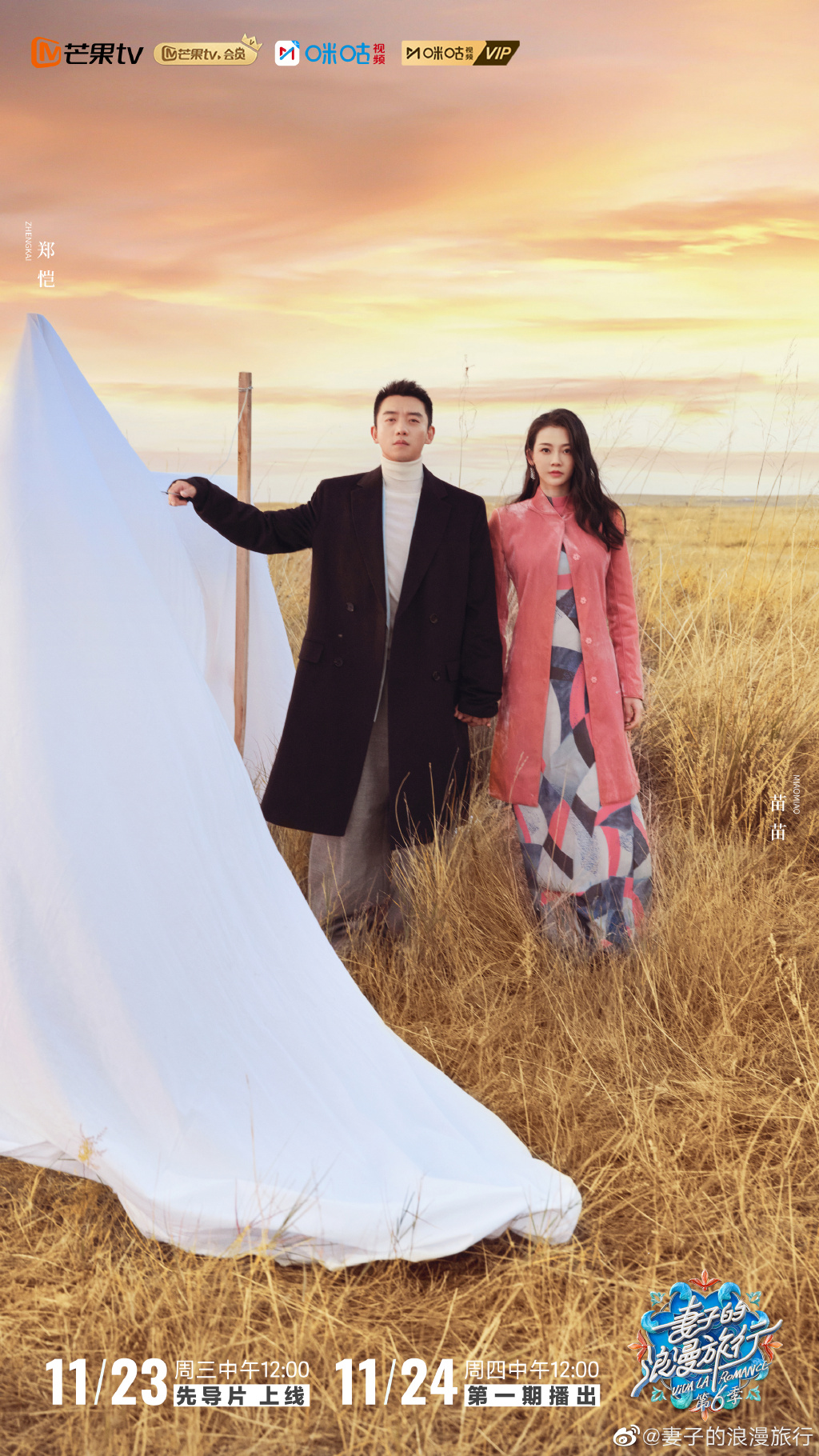 新京报讯 11月22日,综艺节目《妻子的浪漫旅行6》宣布将于11月24日正式开播,苗苗、郑恺,刘芸、郑钧,陈乔恩、曾伟昌,鲍蕾、陆毅,四对夫妻加盟节目。该节目将于11月23日中午12点播出先导片,11月24日起每周四中午12点在芒果TV播出。