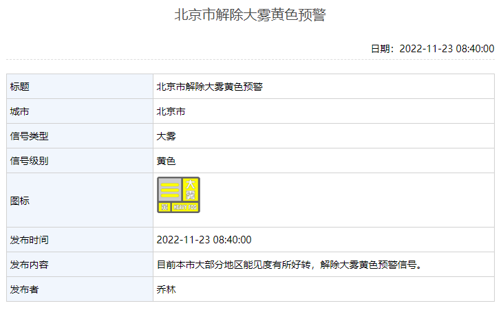 新京报讯 据北京市气象局网站消息,目前本市大部分地区能见度有所好转,解除大雾黄色预警信号。