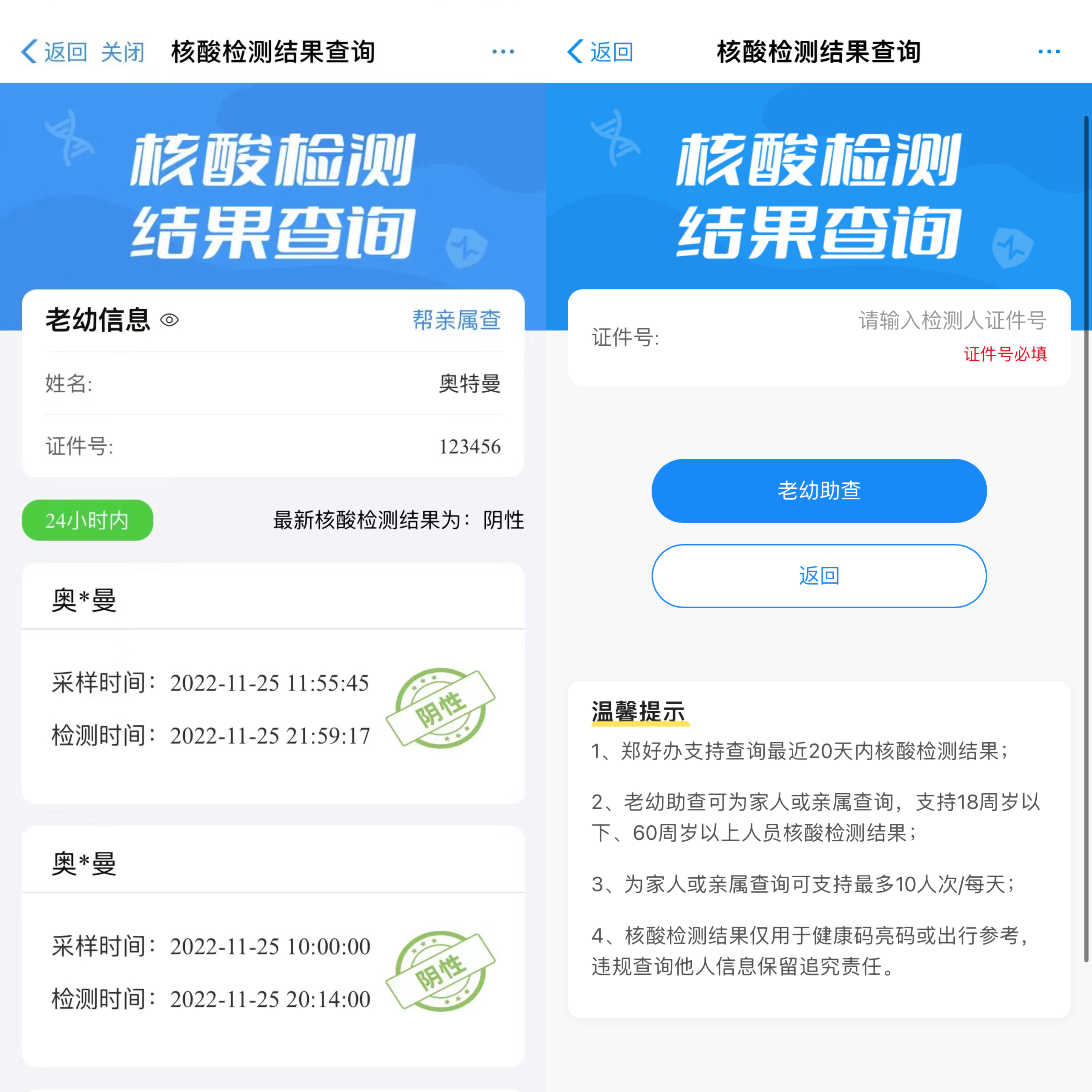 11月26日,有网友反映,在“郑好办APP”核酸检测结果查询页面的“老幼助查”一栏,可输入任意姓名、证件号码,查询到核酸检测结果。有网友在姓名一栏输入“奥特曼”等虚拟人物姓名,在证件号一栏输入“123456789”等随机数字后,检测结果显示均为阴性,同时带有精确到秒的采样时间和检测时间。“郑好办APP”显示,郑好办支持查询最近20天内核酸检测结果;“老幼助查”可为家人或亲属查询,支持18周岁以下、60周岁以上人员核酸检测结果;为家人或亲属查询可支持最多10人次/每天。