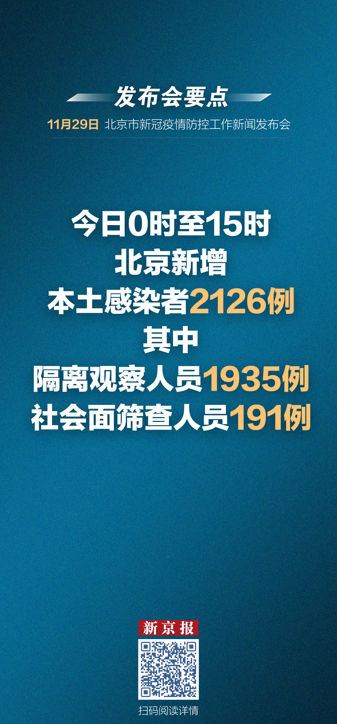 11月29日,北京召开疫情防控新闻发布会,北京市疾控中心副主任刘晓峰通报,11月29日0时至15时,北京新增本土新冠肺炎病毒感染者2126例。其中,隔离观察人员1935例、社会面筛查人员191例。