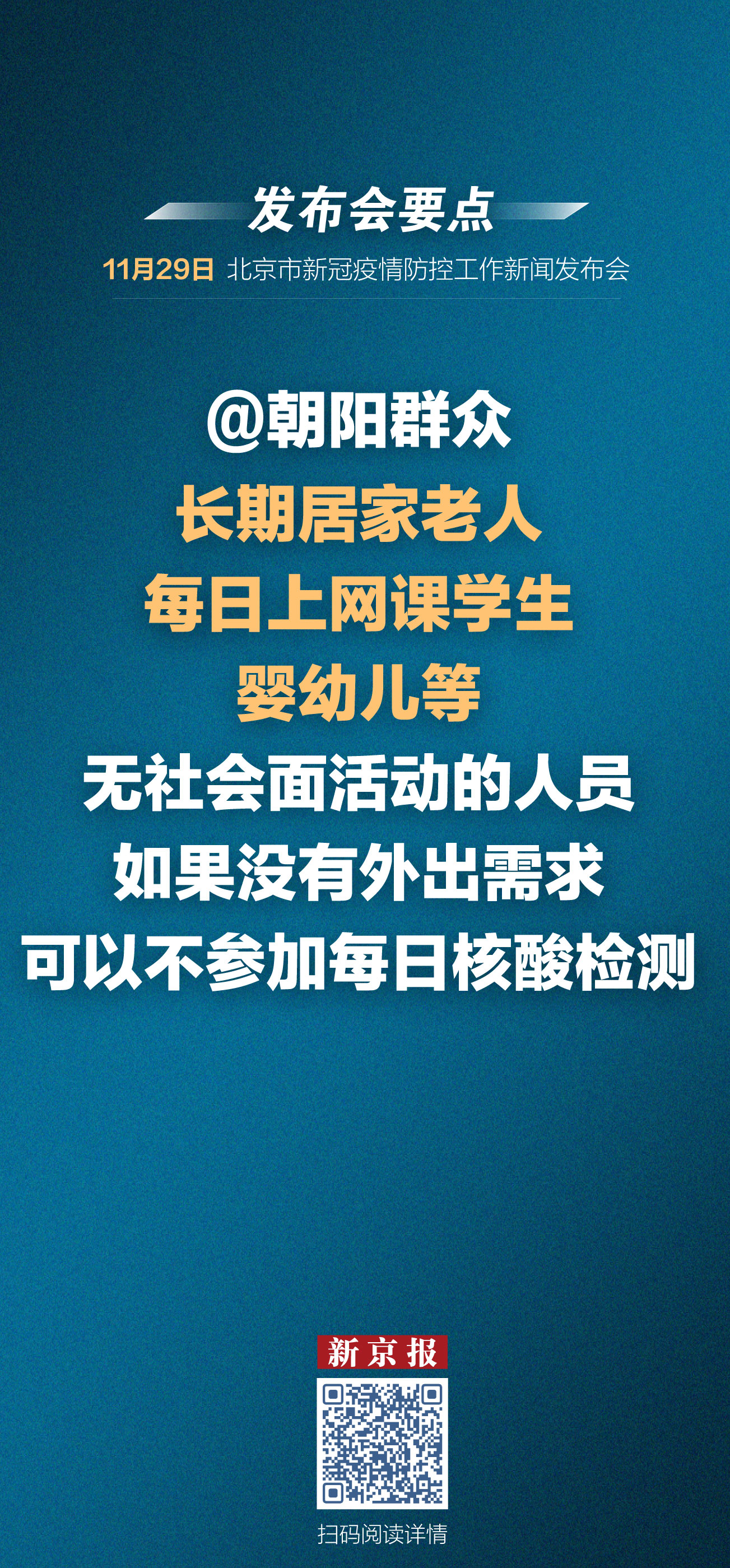 朝阳区人民政府副区长孟锐表示,有针对性地对部分群体实行免检,推行“愿检尽检”,长期居家老人、每日上网课学生、婴幼儿等无社会面活动的人员,如果没有外出需求,可以不参加每日核酸检测。