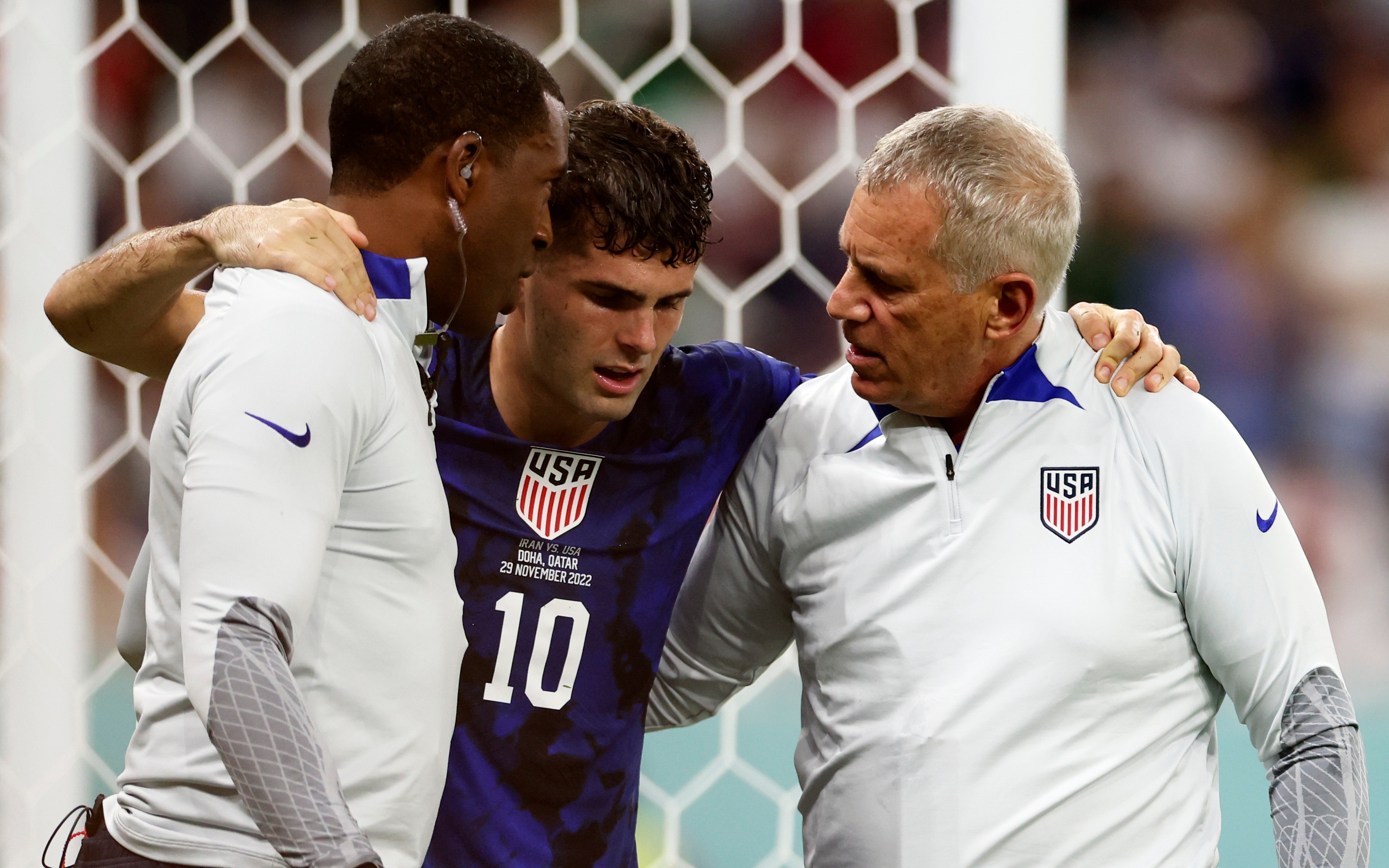 普利希奇(中)进球后受伤接受治疗。 新华社记者 曹灿 摄