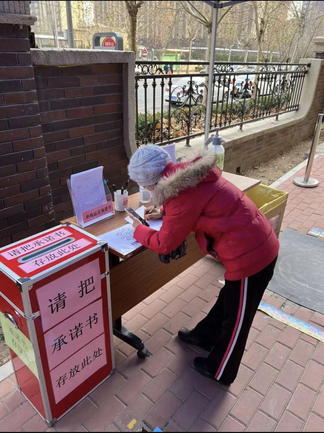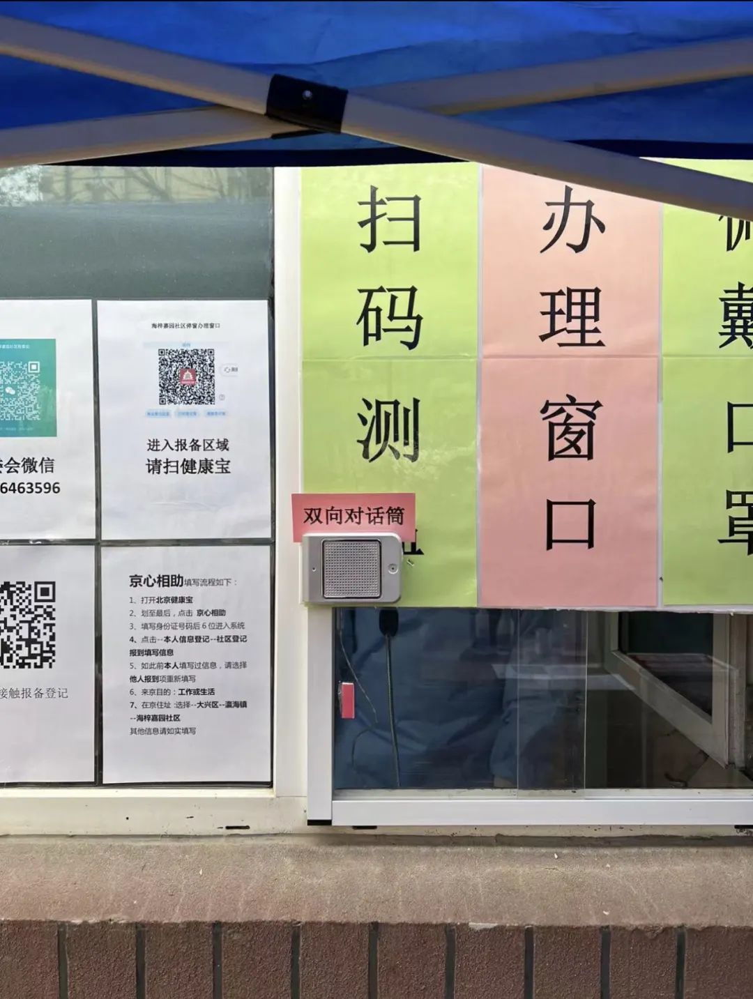 业务办理窗口安装了可活动的透明窗户,内外都配备了双向扩音器和对讲机,方便工作人员与居民沟通;在窗口外侧的露天区域,社区还放置了红外体温仪、报备人员专用签字笔、返京“无接触报备”登记码和承诺书存放箱等物品,并通过宣传板提示,引导居民自助完成填报流程。海梓嘉园社区党总支书记刘卫华说: