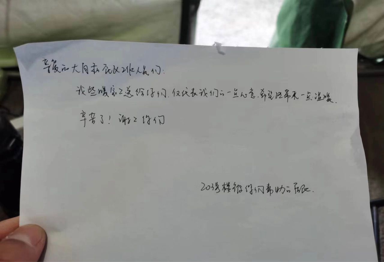 社区工作人员的暖心和细心也得到了居民们的回应,“在203号楼进行服务保障的时候,由于天气冷,居民为大家送来了暖贴。202号楼解封后,居民特意下楼与大家一一握了手,感谢大家的辛苦付出。”张雷回忆道。203号楼居民在一张纸上这样写道:“亲爱的‘大白’和社区工作人员们:找些暖宝宝送给你们,仅代表我们的一点心意,希望能带来一点温暖。辛苦了,谢谢你们!”落款是“203号楼被你们帮助的居民”。