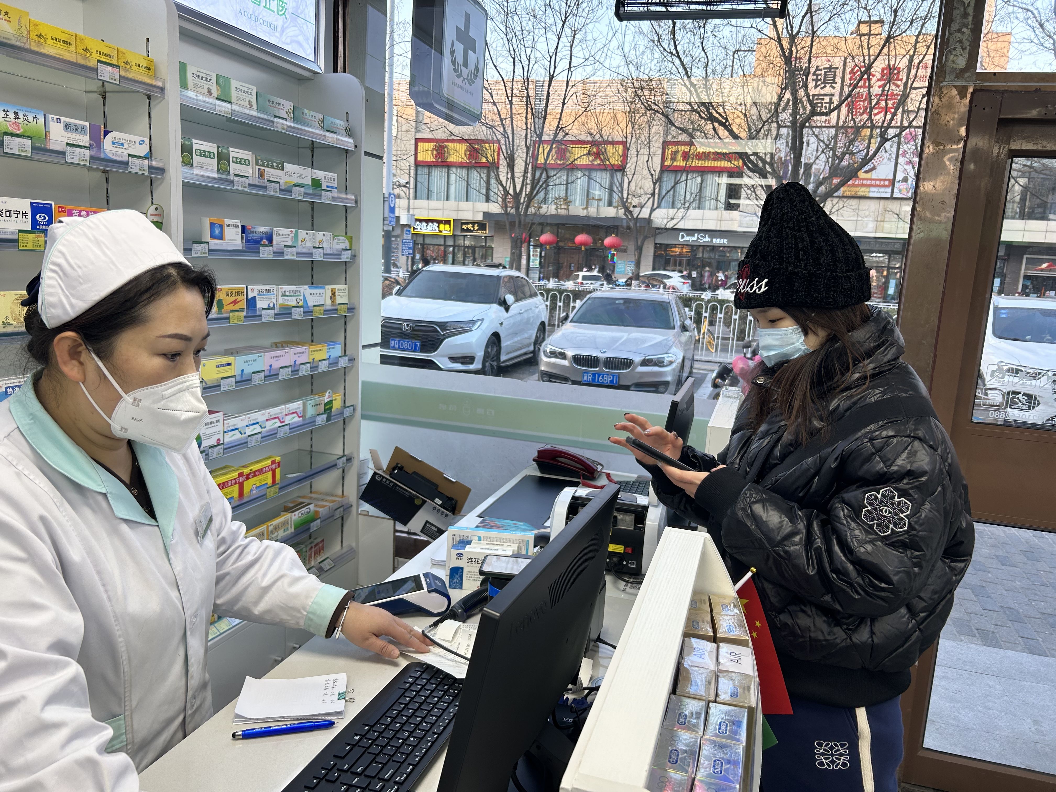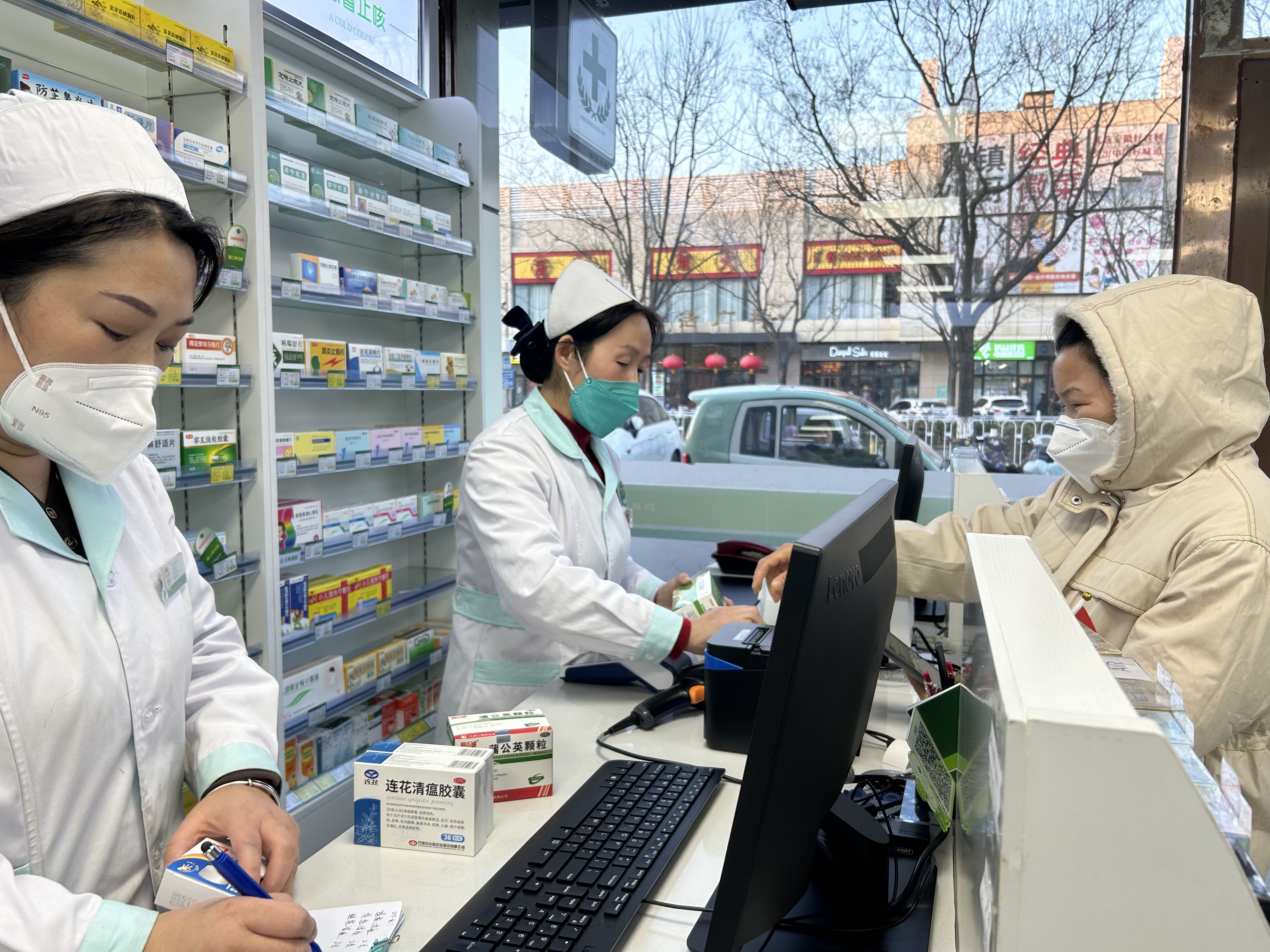通州区乔庄北街百康药店内,不少市民进店购买药物,所购药品以感冒、退烧类为主。 新京报记者 陈琳 摄