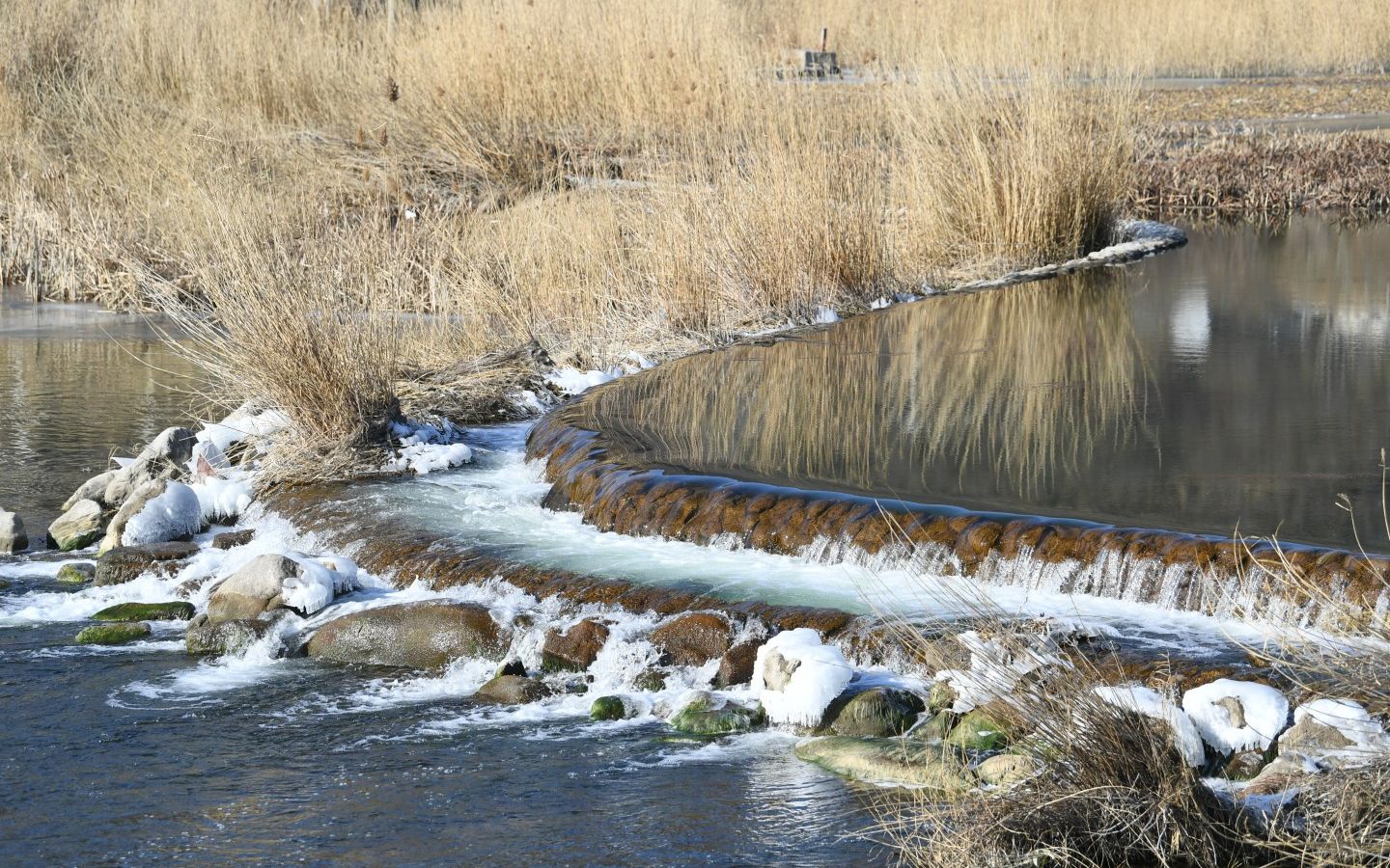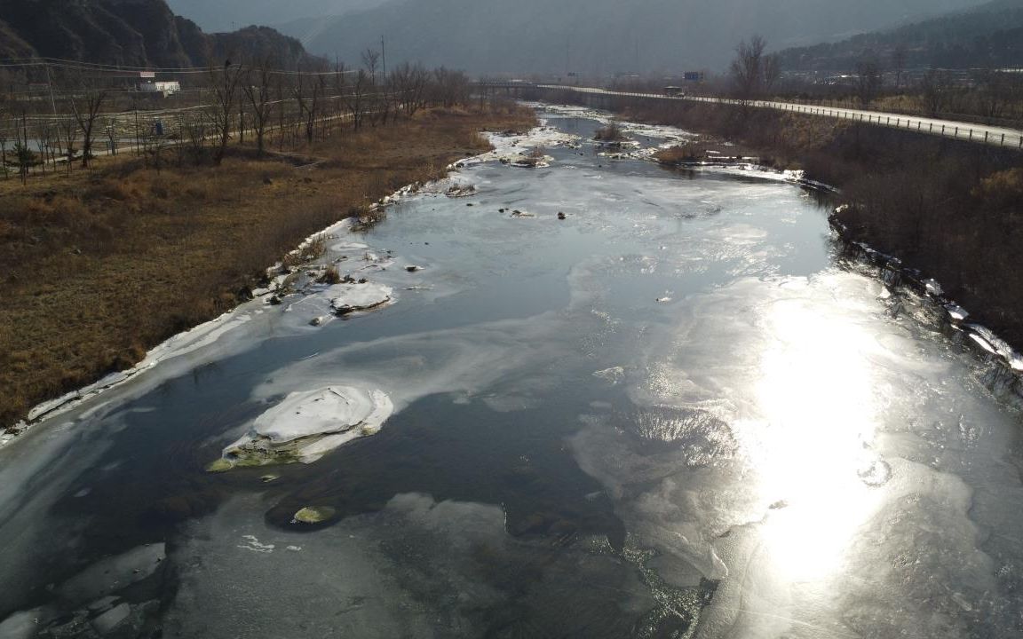在王平湿地附近,京西深山区和浅山区交界处,冰面占据了大半部分河道,水流湍急的地方,石头上也结出了冰凌。