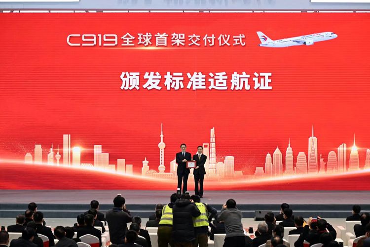 在交付环节,C919主制造商中国商飞向东航交付“C919全球首架纪念钥匙”,并颁发飞机销售证。
