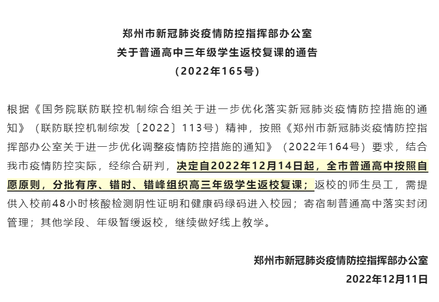 新京报讯 据郑州发布微信公众号消息,根据《国务院联防联控机制综合组关于进一步优化落实新冠肺炎疫情防控措施的通知》(联防联控机制综发〔2022〕113号)精神,按照《郑州市新冠肺炎疫情防控指挥部办公室关于进一步优化调整疫情防控措施的通知》(2022年164号)要求,结合郑州市疫情防控实际,经综合研判,决定自2022年12月14日起,全市普通高中按照自愿原则,分批有序、错时、错峰组织高三年级学生返校复课;返校的师生员工,需提供入校前48小时核酸检测阴性证明和健康码绿码进入校园;寄宿制普通高中落实封闭管理;其他学段、年级暂缓返校,继续做好线上教学。