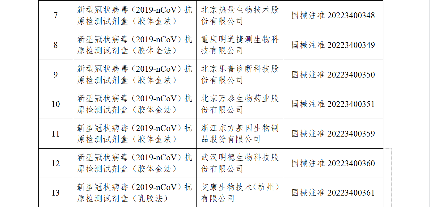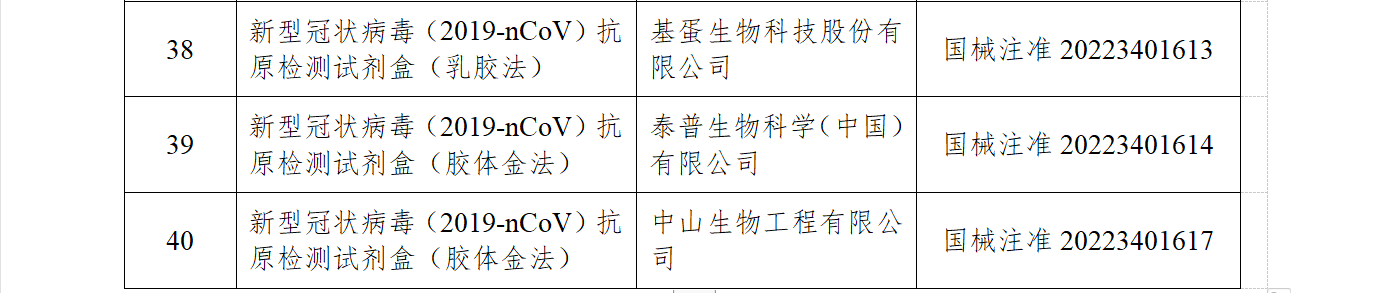 新京报讯(记者陈琳)12月11日,经国家药监局审查,批准中山生物工程有限公司的新冠病毒抗原检测试剂产品。截至目前,国家药监局已批准40个新冠病毒抗原检测试剂产品。