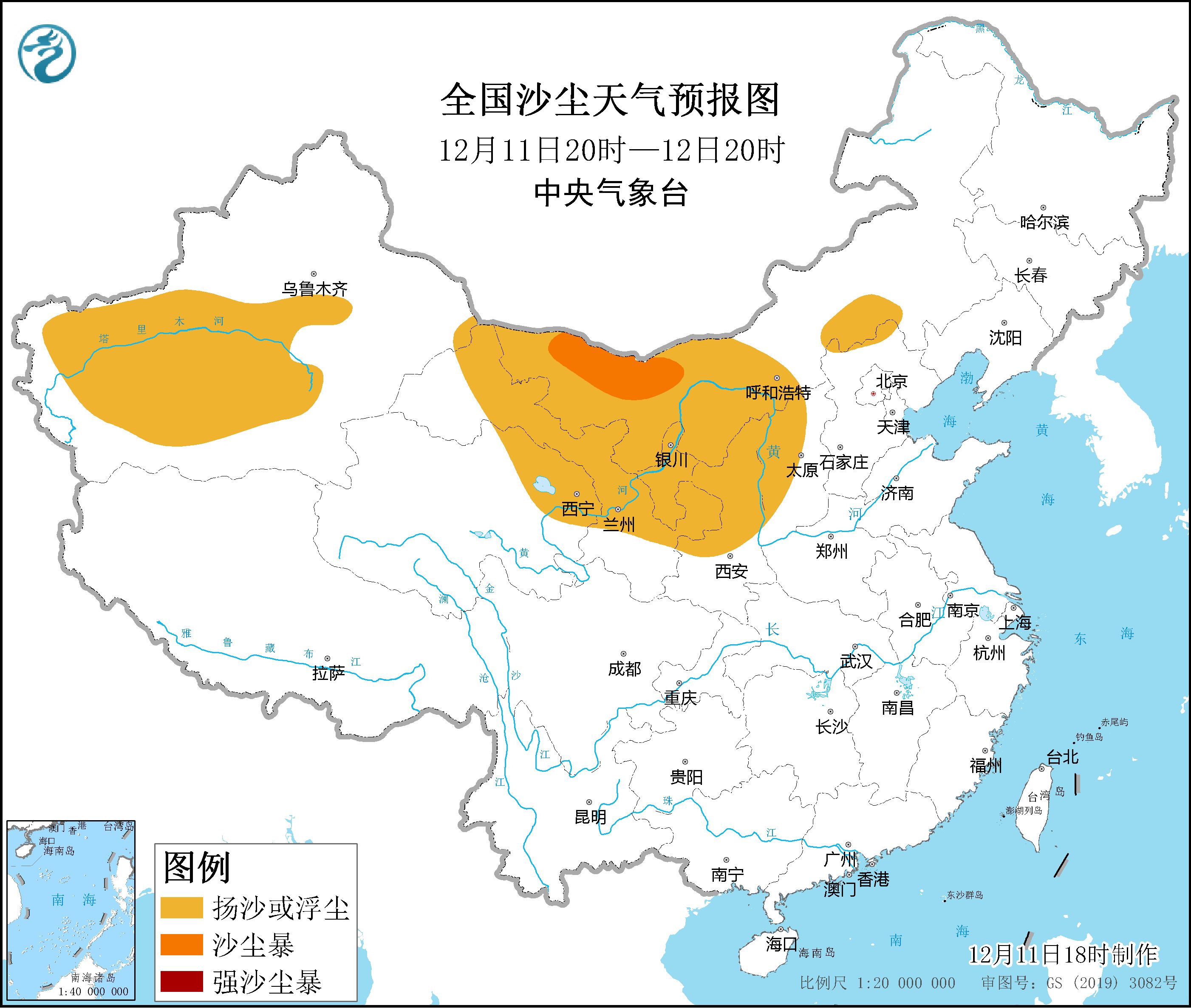 今天下午,中央气象台继续发布沙尘暴蓝色预警。受冷空气、大风影响,预计12月11日20时至12日20时,内蒙古中西部、甘肃、青海东北部、宁夏、陕西北部、山西西部以及新疆塔里木盆地等地的部分地区有扬沙或浮尘天气,其中,内蒙古西北部局地有沙尘暴。
