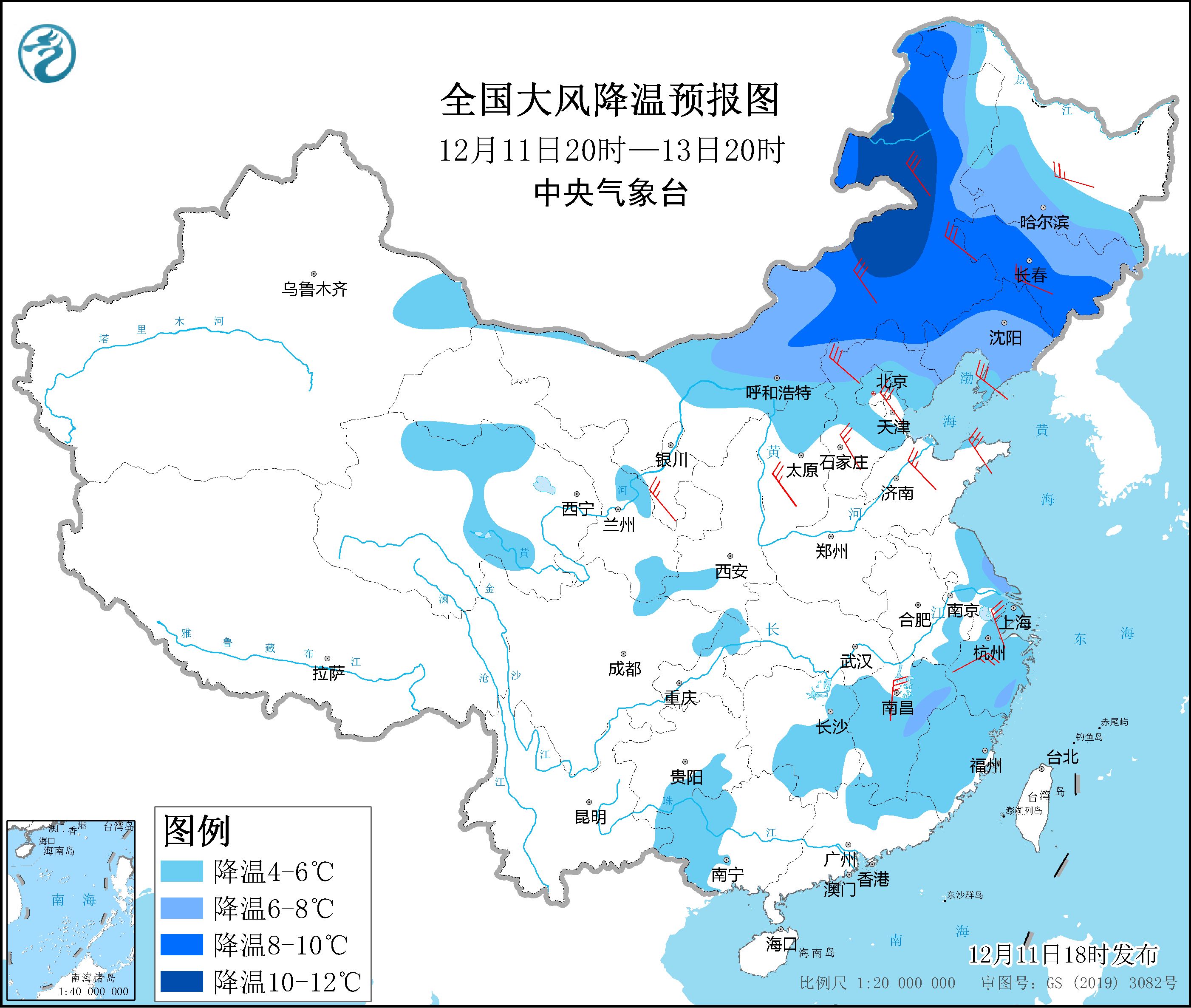 12月11日-13日全国大风降温预报图。中央气象台供图