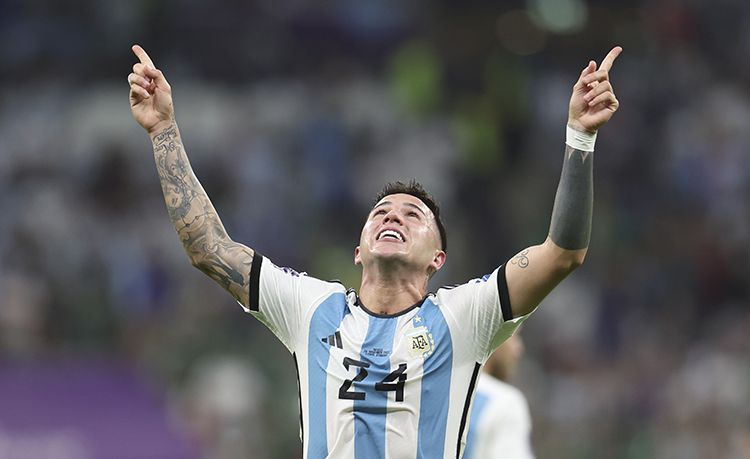 11月26日,阿根廷队球员恩佐·费尔南德斯庆祝进球。
