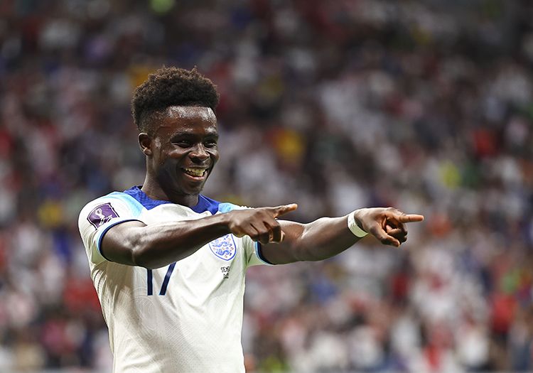 12月4日,英格兰队球员萨卡在比赛中庆祝进球。
