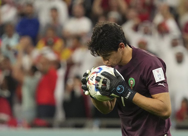 12月6日,摩洛哥队守门员布努在点球大战中扑出对手射门后亲吻足球。