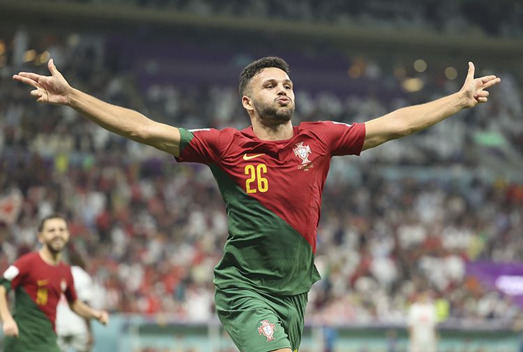 12月6日,葡萄牙队球员冈卡洛·拉莫斯在比赛中庆祝自己本场比赛第三粒进球。